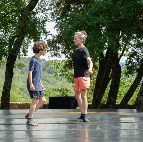 Afficher le planDanseuse, chorégraphe, mère — Marion Carriau ne veut pas choisir. Avec ses deux fils sur scène, elle tourne sans s'arrêter et nous invite à considérer que maternité et création peuvent coexister. Tout commence par un quiproquo. Dublin, mai 2023 : Marion Carriau arrive en résidence, aucun studio n'a été réservé. Elle se retrouve seule sur la plage de Bull Island, face au vide et à la culpabilité d'être loin de ses enfants. Jusqu'au jour où ses fils la rejoignent et jouent dans le sable — librement, sans raison d'autre que le plaisir. Quelque chose se dénoue. Sur le plateau de Ditto to the sand, chacun est à sa tâche. Elle tourne, longtemps. Eux dessinent des lignes de scotch sur le sol, traversent l'espace, parfois l'imitent. Ils se considèrent, ils s'ignorent — comme à la maison, comme partout où l'on tente de tout mener de front. Un choix qu'elle revendique comme féministe et militant : ne jamais abandonner l'un pour l'autre.